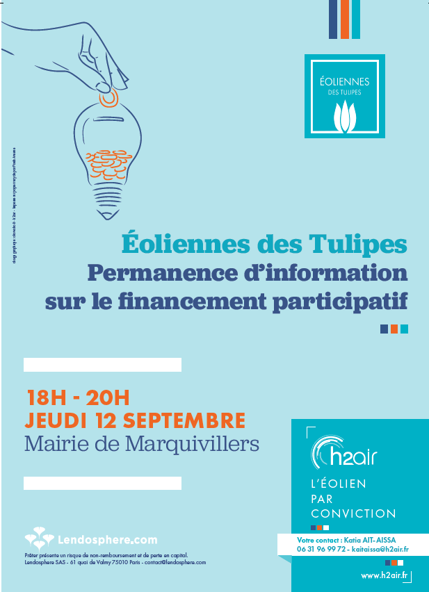 Close le 1er octobre 2019, l'opération de financement participatif proposée par H2air aux riverains du chantier éolien des Tulipes a permis la collecte de 250 000€. Quelque 144 habitants des Hauts-de-France ont prêté sur la plateforme Lendosphere. L'objectif a été atteint en seulement 15 jours !