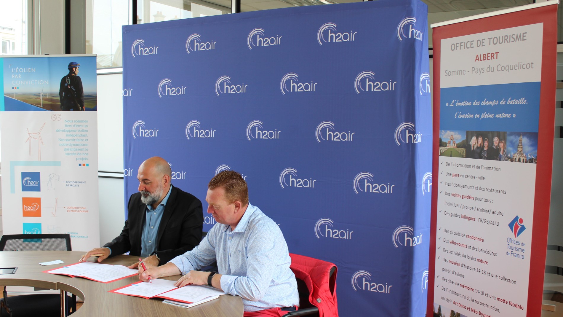 Roy MAHFOUZ, président-fondateur de h2air & Franck BEAUVARLET, président de l'office de tourisme du Pays du CoquelicotDéveloppeur et exploitant trois parcs éoliens dans le Pays du Coquelicot, h2air a formé les guides-conférienciers de l'office de tourisme et a conçu un dépliant pédagogique à destination des touristes.L'office de tourisme a tenu un stand d'information à l'occasion de la Journée mondiale de l'énergie éolienne, lors de laquelle plusieurs évènements sportifs étaient organisées.