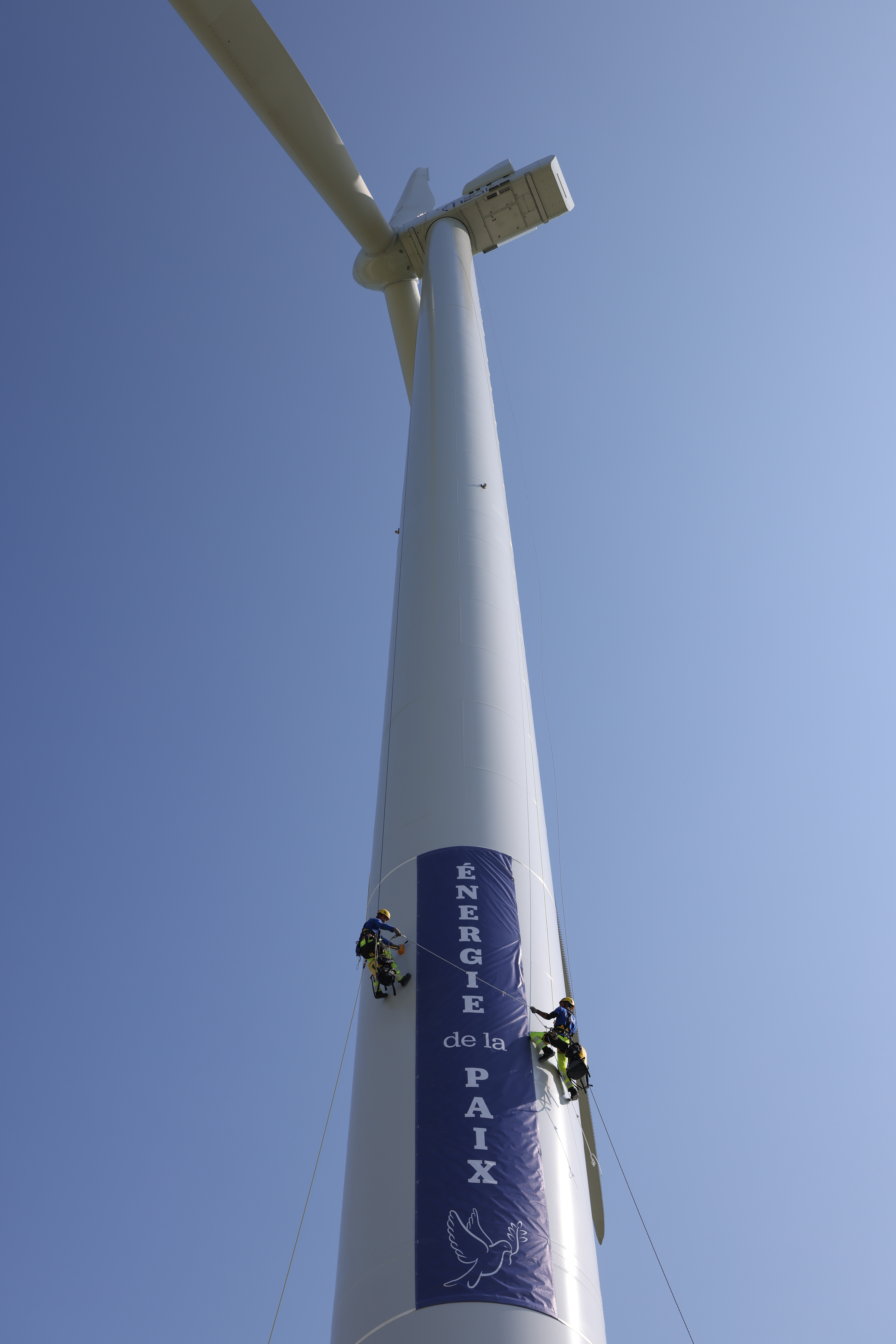 L'assistance a ensuite pu admirer les descentes en rappel effectuées par les cordistes d’Eolica le long du mât arborant le slogan "Energie de la Paix".