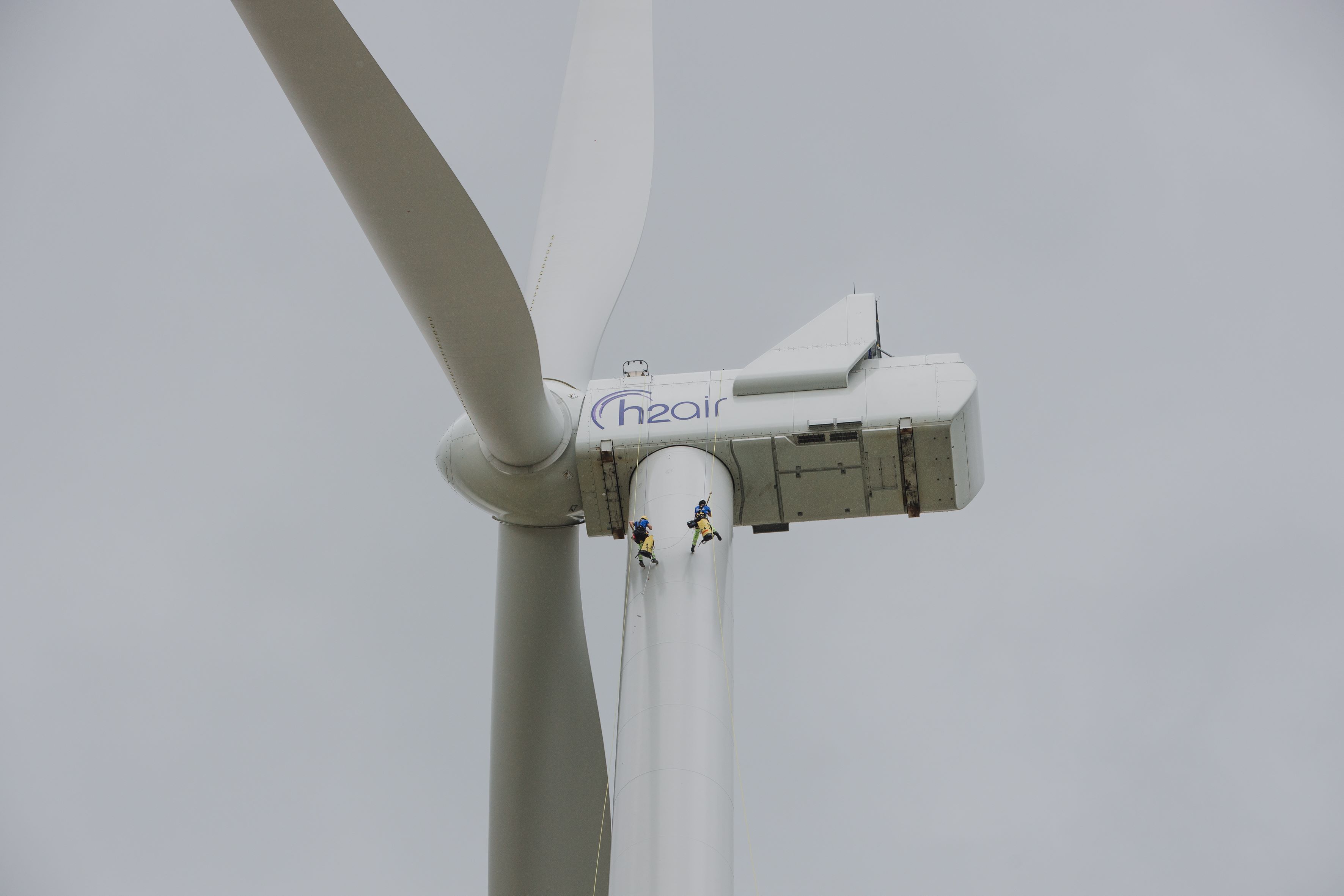 L'assistance a ensuite pu admirer les descentes en rappel effectuées par les cordistes d’Eolica le long du mât arborant le slogan « Energie de la Paix ». Thomas Fabre et Vicky Itchner ont bravé les intempéries pour mener à bien leur mission, avec l’aide de Jérémy Hardy, coordinateur sécurité.
